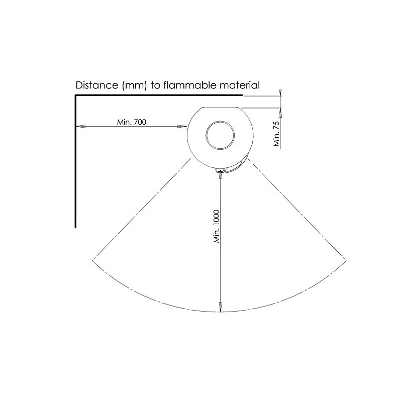 – Distance aux matériaux inflammables : Arrière : 7,5 cm ; Côtés : 70 cm ; Distance de sécurité / aux meubles : 100 cm ;