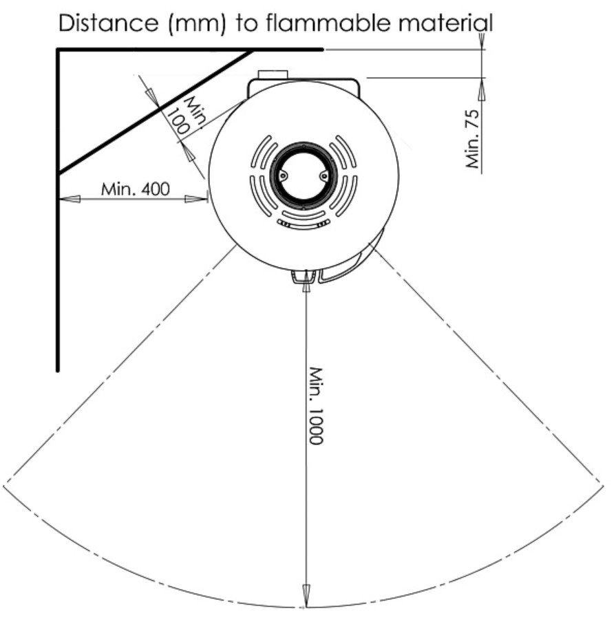 – Distance aux matériaux inflammables : Arrière : 7,5 cm ; Côtés : 40 cm ; Si installé dans un angle : 10 cm ; Distance de sécurité / aux meubles : 100 cm