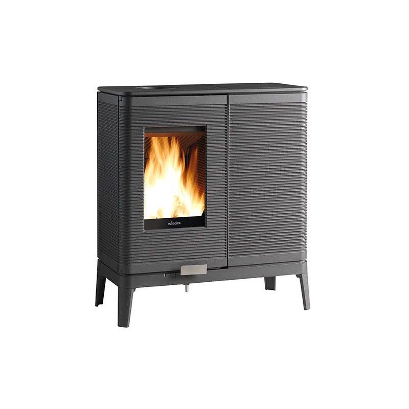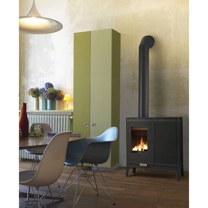 La finition striée anthracite d’Akimix accentue son allure très contemporaine. D’un côté, une façade vitrée laisse entrevoir la magie des flammes et permet de recharger les bûches. D’un autre côté, il possède une trémie d’une capacité de 15kg pour les granulés. Ce poêle est une véritable innovation technologique qui encombre peu, d’autant plus qu’il est monté sur 4 pieds pour une déco aérée et épurée.